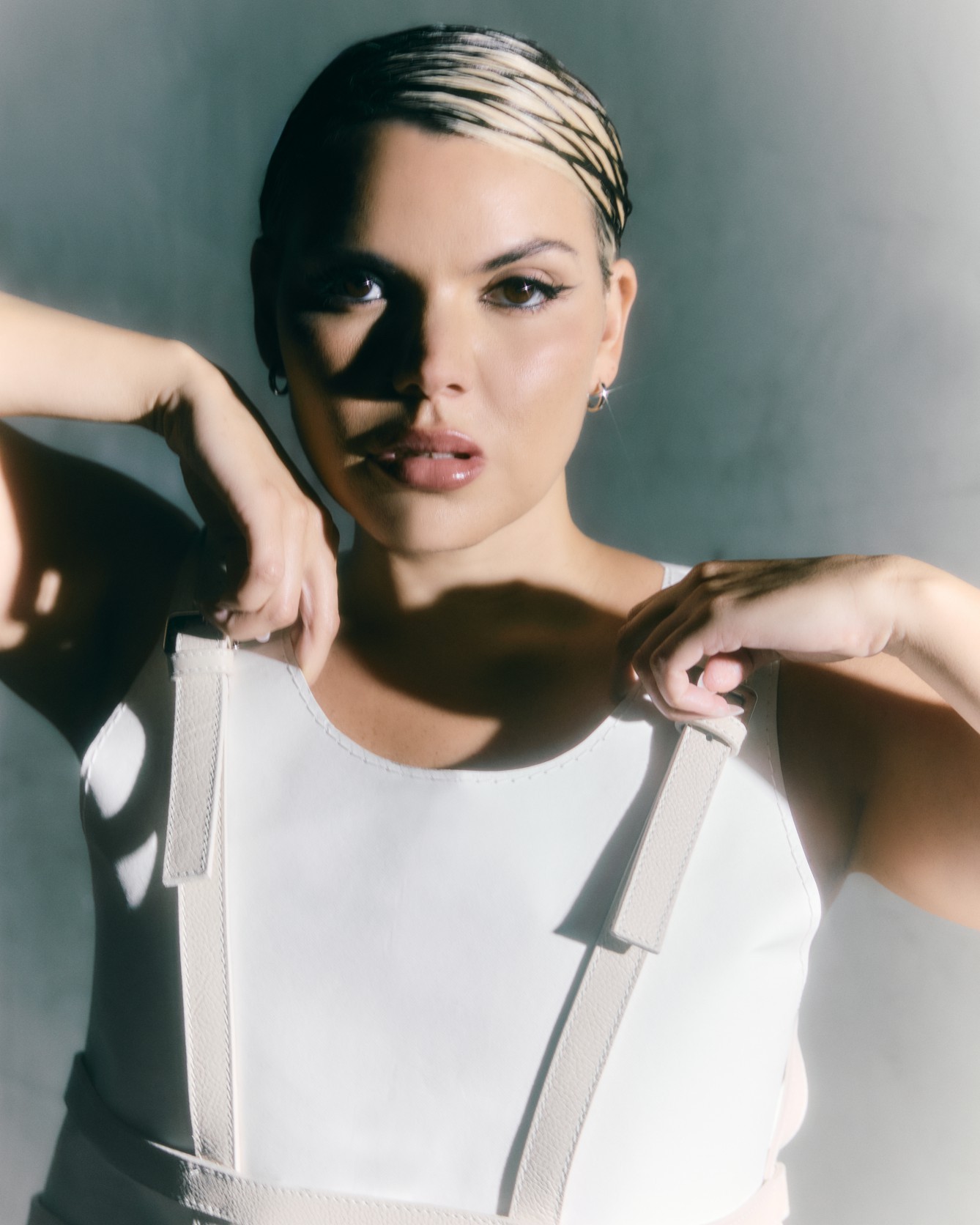 Regata em papel e harness em couro Misci,brincos Lilac — Foto: Pedro Loreto