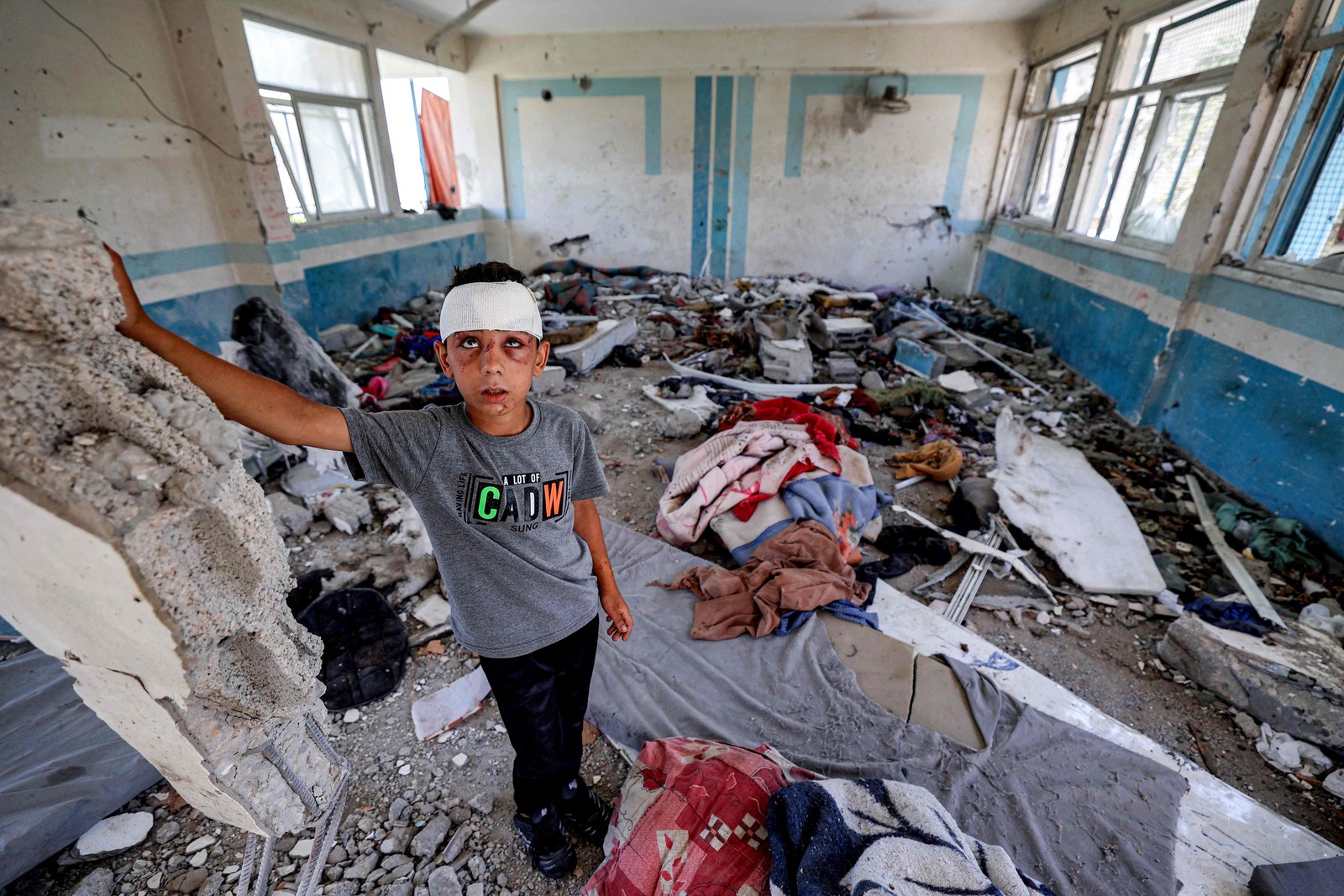 Escola administrada pela Agência de Assistência e Obras da ONU para os Refugiados da Palestina (UNRWA),que foi atingida por bombardeios israelenses,no campo de Nuseirat,no centro da Faixa de Gaza — Foto: Eyad BABA / AFP