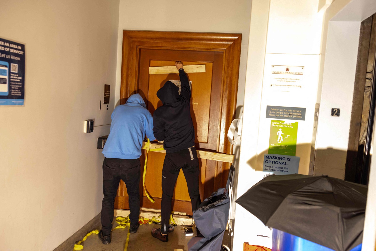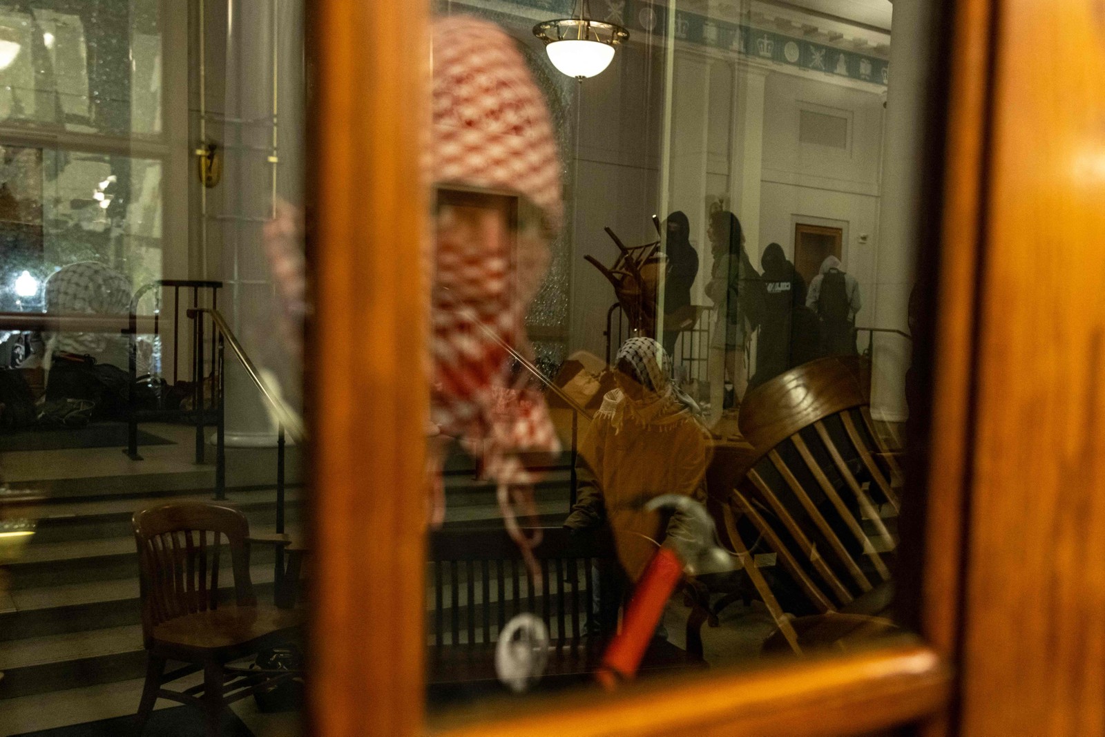 Manifestantes do acampamento pró-Palestina no Campus de Columbia barricam-se dentro do Hamilton Hall,onde o escritório do Reitor está localizado — Foto: Alex Kent/Getty Images/AFP
