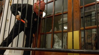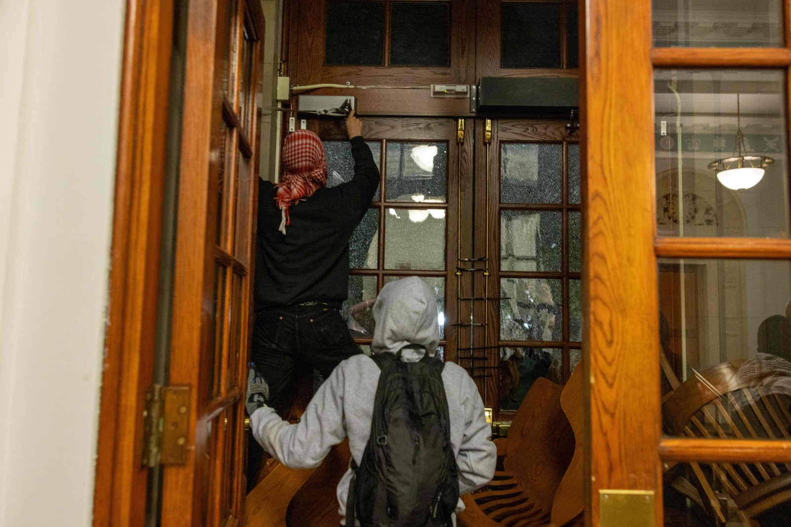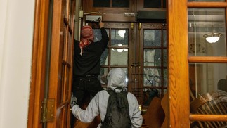 Um manifestante quebra as janelas da porta da frente do prédio para prender uma corrente em torno dele para impedir a entrada das autoridades na terça-feira,30 de abril de 2024,na cidade de Nova York. — Foto: Alex Kent/Getty Images/AFP