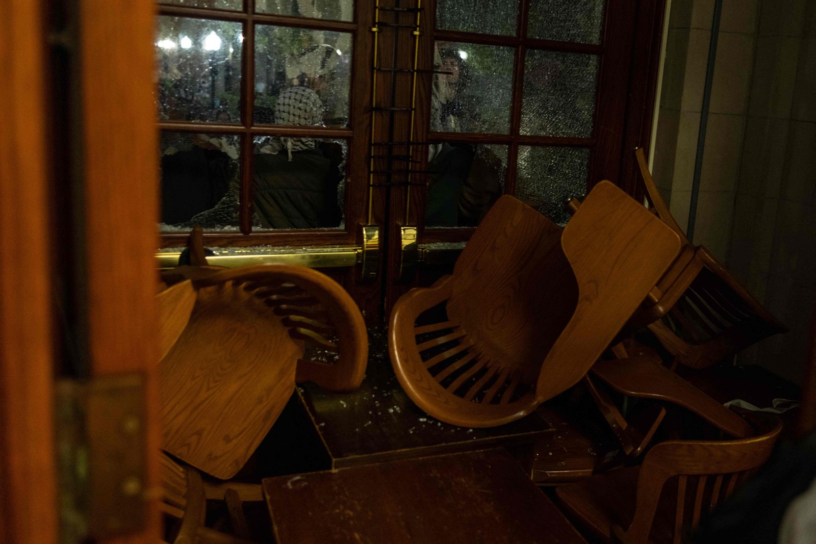 Cadeiras,mesas e barricadas são usadas para bloquear as portas enquanto manifestantes do acampamento pró-Palestina no Campus de Columbia se barricam dentro do Hamilton Hall,onde o escritório do Reitor está localizado — Foto: Alex Kent/Getty Images/AFP