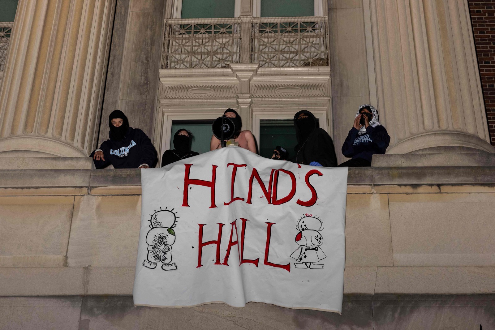 Manifestantes do acampamento pró-Palestina no Campus de Columbia mostram uma faixa enquanto se barricam dentro do Hamilton Hall,onde está localizado o escritório do Reitor — Foto: Alex Kent/Getty Images/AFP