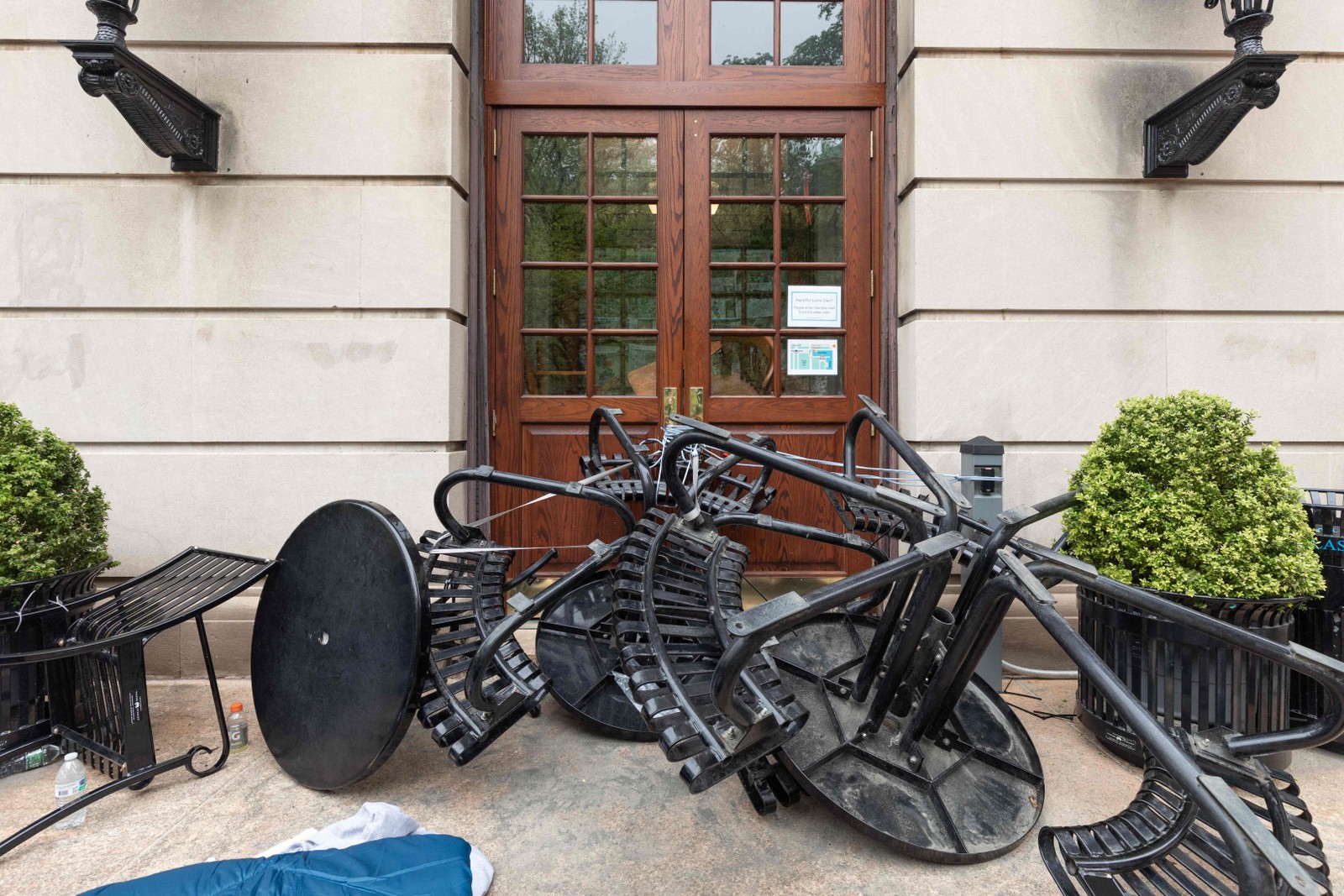 Mesas e cadeiras estão amarradas à porta,bloqueando a entrada do Hamilton Hall da Universidade Columbia,na cidade de Nova York — Foto: Emily Byrski / AFP