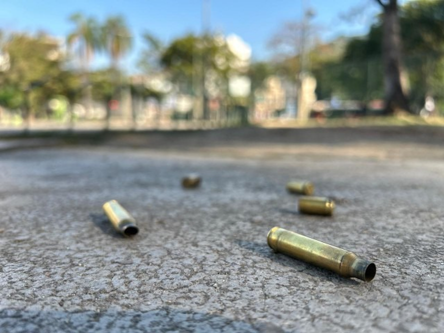 Cápsulas de balas ainda estavam na Praça Barão de Drumond,em Vila Isabel,na manhã desta segunda-feira,horas depois de tiroteio que deixou mortos e feridos em uma festa — Foto: Gabriel de Paiva/Agência O Globo