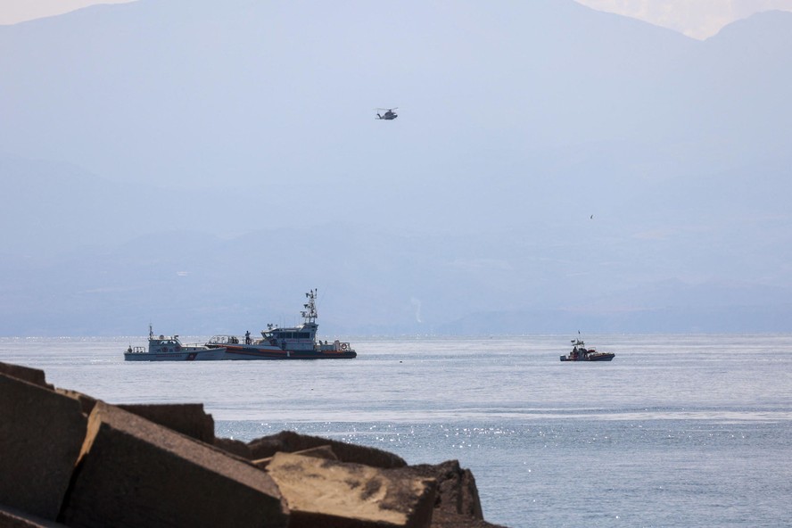 Navios da Guarda Costeira italiana e helicópteros dos bombeiros seguem as buscas pelos desaparecidos próximo ao porto de Porticello,onde o iate de luxo afundou — Foto: Igor Petyx /ANSA/AFP