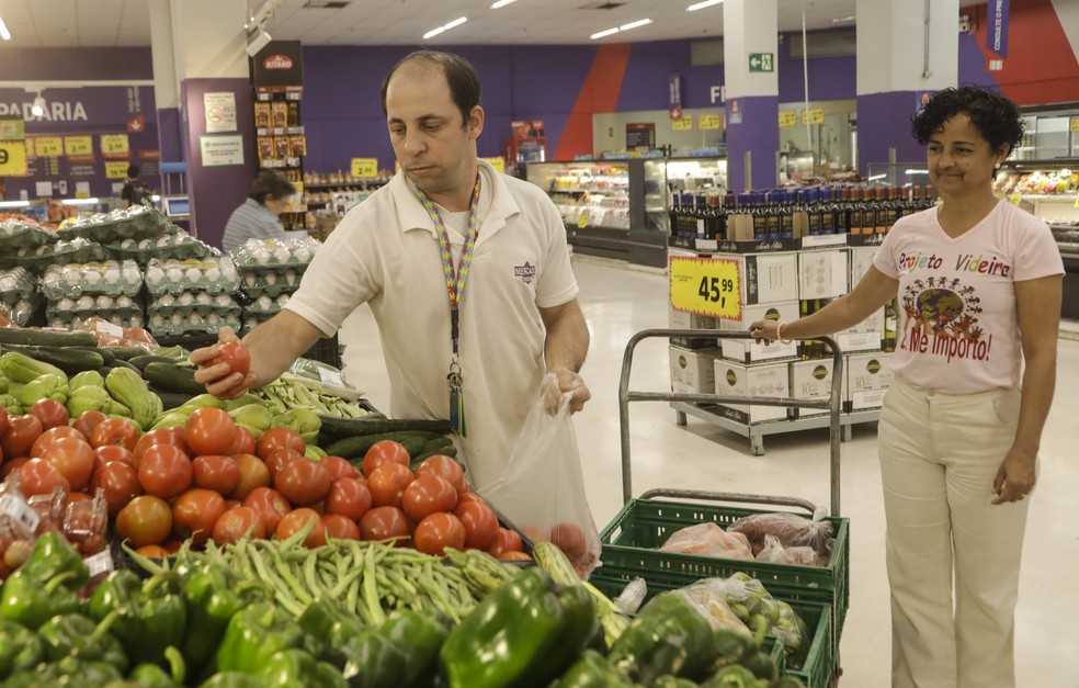 Janete observa funcionário do Extra recolher legumes maduros para doar para a ONG que ela lidera na Zona Norte do Rio — Foto: Gabriel de Paiva
