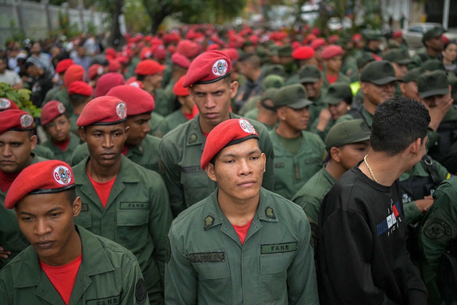 Membros da Força Armada Nacional Bolivariana (FANB) fazem fila em uma seção eleitoral durante a eleição presidencial venezuelana — Foto: Yuri CORTEZ / AFP
