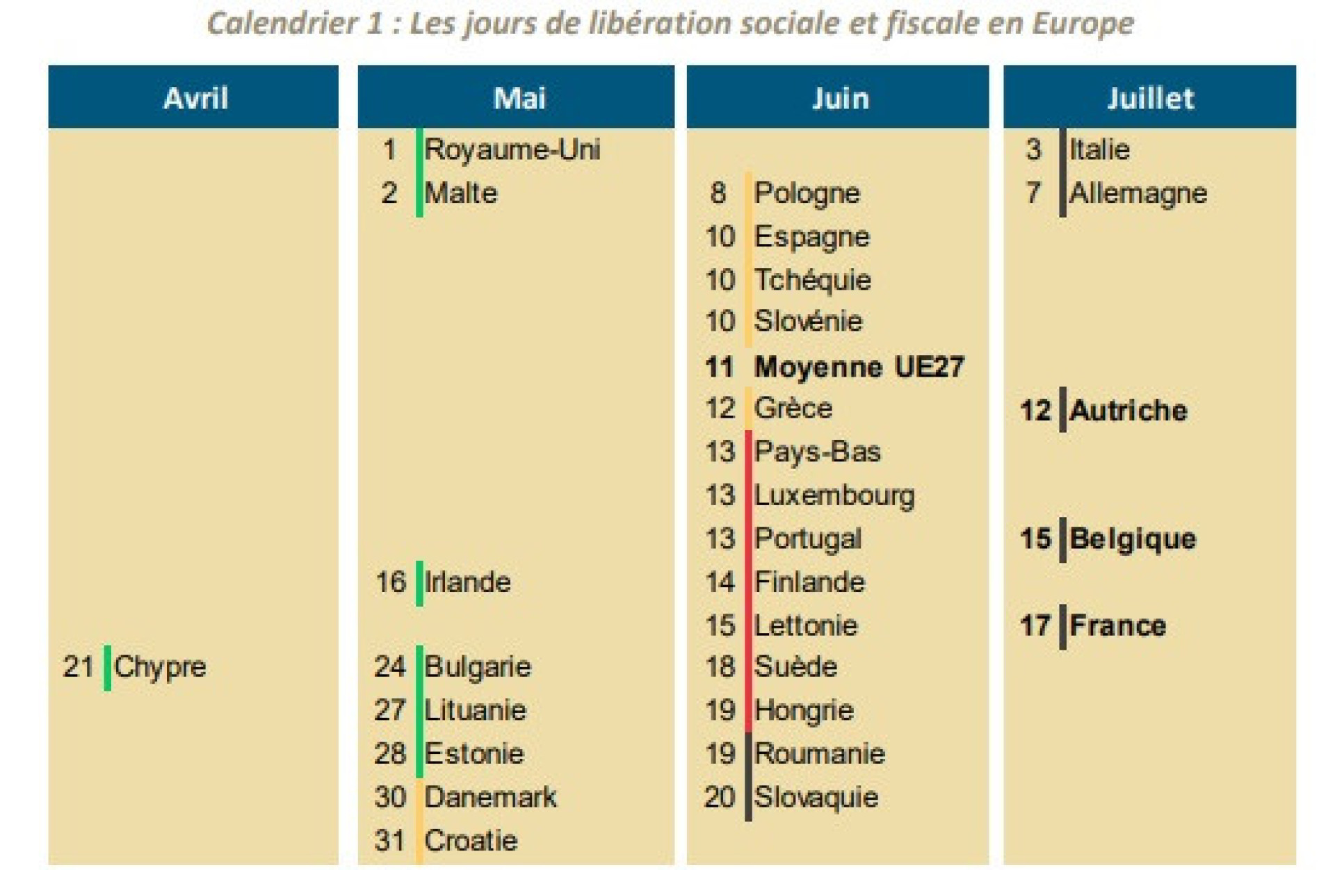 França é o país que mais tarde se liberta dos impostos,a 17 de julho,o que significa que tem a carga fiscal mais alta da Europa. Em sentido contrário,o Chipre é o país que se destaca,libertando-se dos impostos fiscais a 21 de abril,seguido do Reino Unido e de Malta (a 1 e 2 de maio,respetivamente).