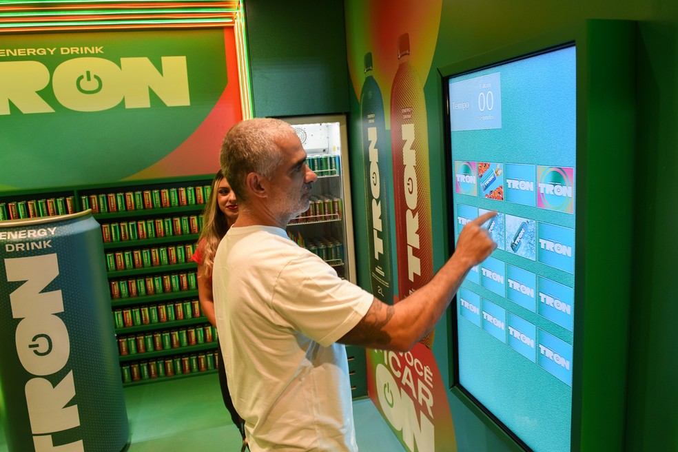 O espaço do energético Tron também tem jogo da memória,mas é num telão e com contagem de tempo,valendo um cordão porta-copo.