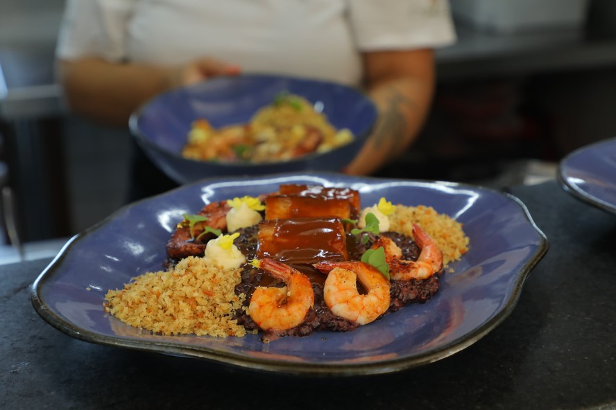 Fogo e Paixão,risoto de arroz negro com barriga de porco,camarão flambado,polvo e requeijão de queijo de cabra do quiosque QuiQui,vencedor do prêmio Sabores da Orla — Foto: Divulgação/Alexandre Macieira