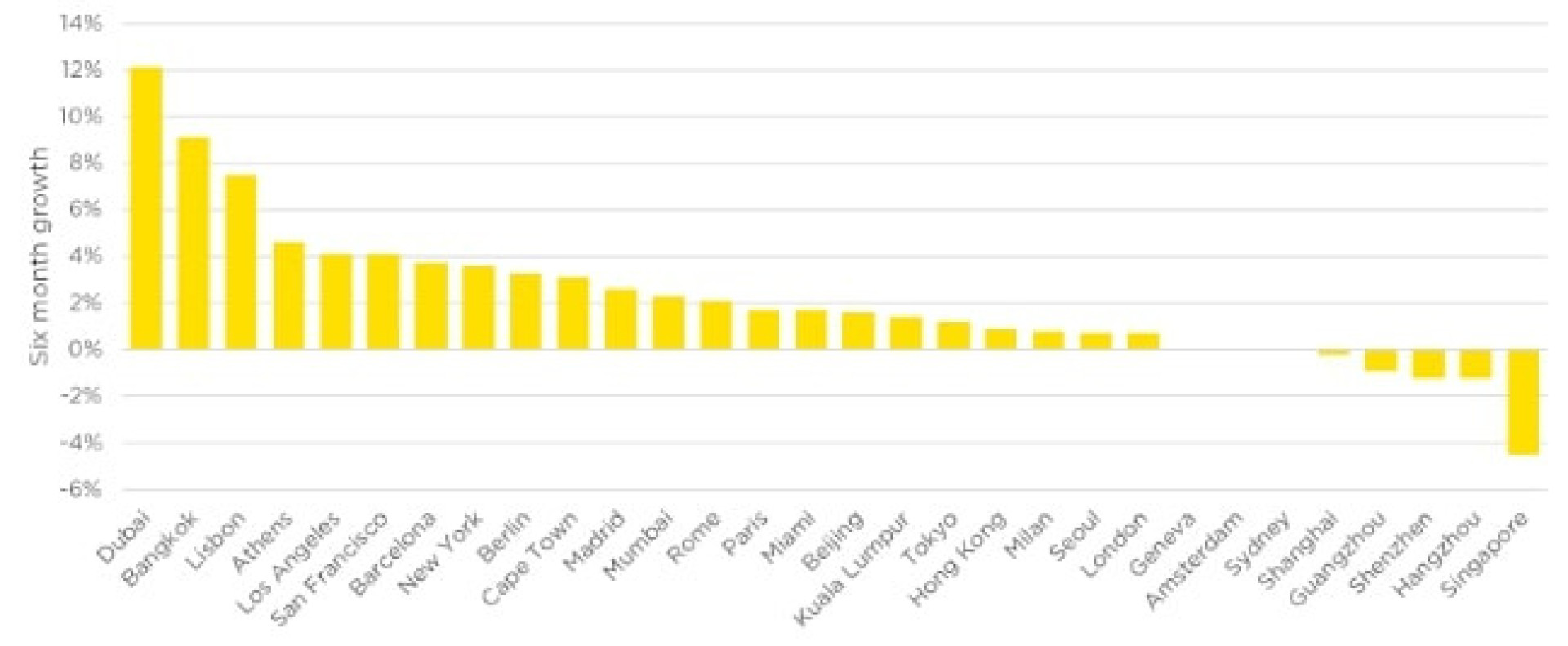 "Os valores de arrendamento de imóveis residenciais de luxo,continuam a superar o 'capital value',e cresceram 2,2% no primeiro semestre do ano. 25 dos 30 mercados analisados,de todo o mundo,registaram um crescimento do valor das rendas, as três cidades com maior crescimento dos valores de arrendamento prime nos primeiros seis meses do ano são o Dubai (12,1%),Banguecoque (9%) e Lisboa (7,5%)",lê-se num comunicado enviado às redações.