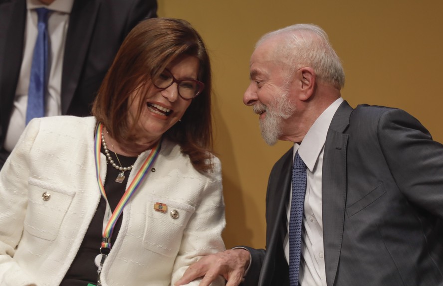 Magda Chambriard ri com Lula em sua posse como presidente da Petrobras,no Rio — Foto: Gabriel de Paiva / Agência O Globo