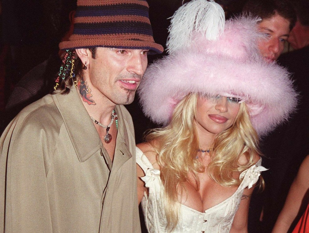 Tommy Lee e Pamela Anderson Lee chegam ao MTV Video Music Awards em setembro de 1999 — Foto: AFP PHOTO/Henny Ray ABRAMS