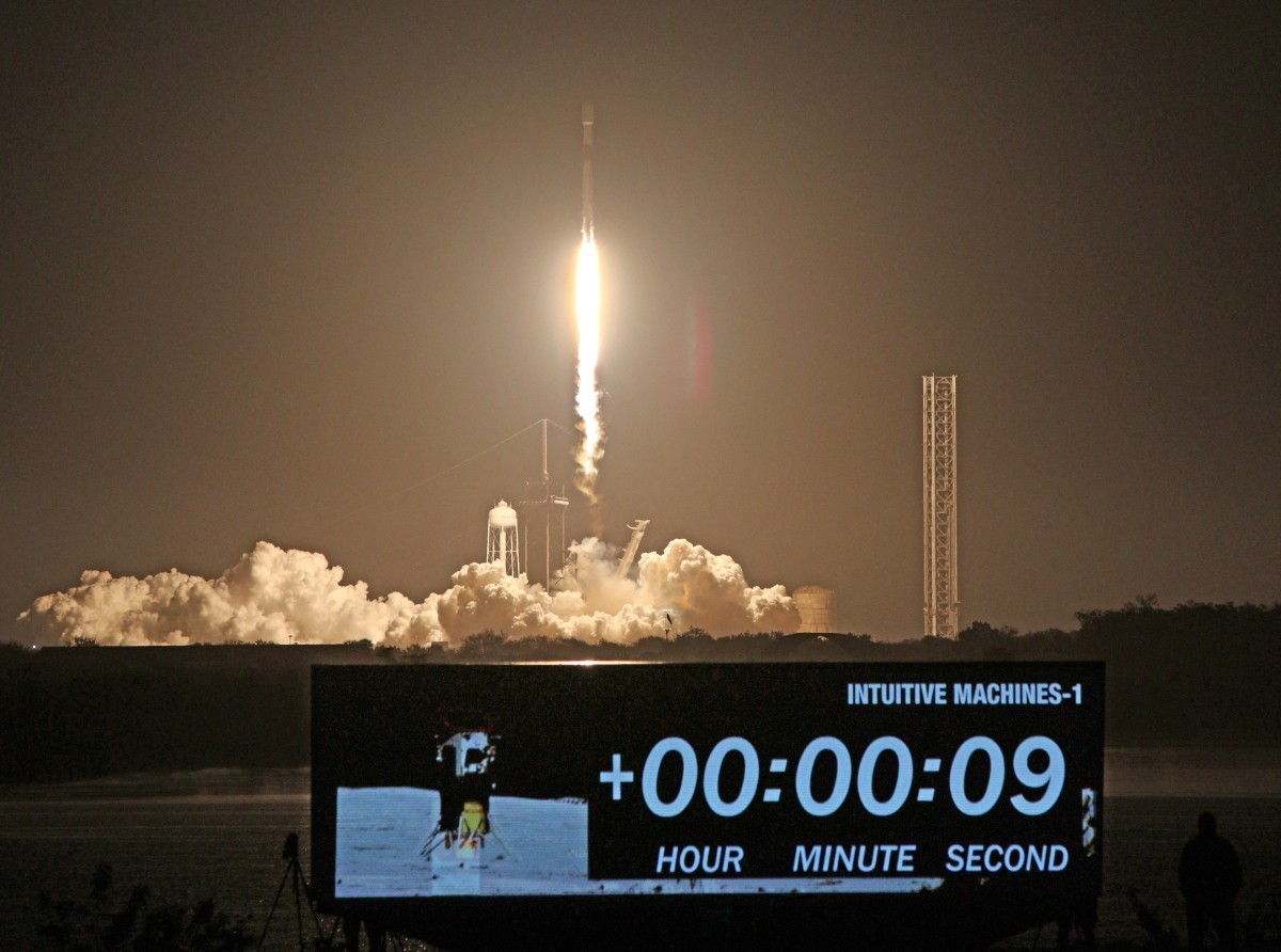 Um foguete SpaceX Falcon 9 decola da plataforma de lançamento LC-39A no Kennedy Space Center com a missão do lander lunar Nova-C da Intuitive Machines,em Cape Canaveral,Flórida,em 15 de fevereiro de 2024 — Foto: GREGG NEWTON / AFP