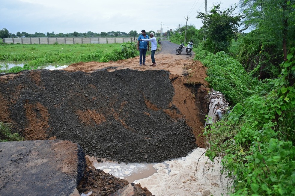 Observadores inspecionam uma estrada danificada por fortes chuvas nos arredores de Ahmedabad em 28 de agosto de 2024 — Foto: Sam PANTHAKY / AFP