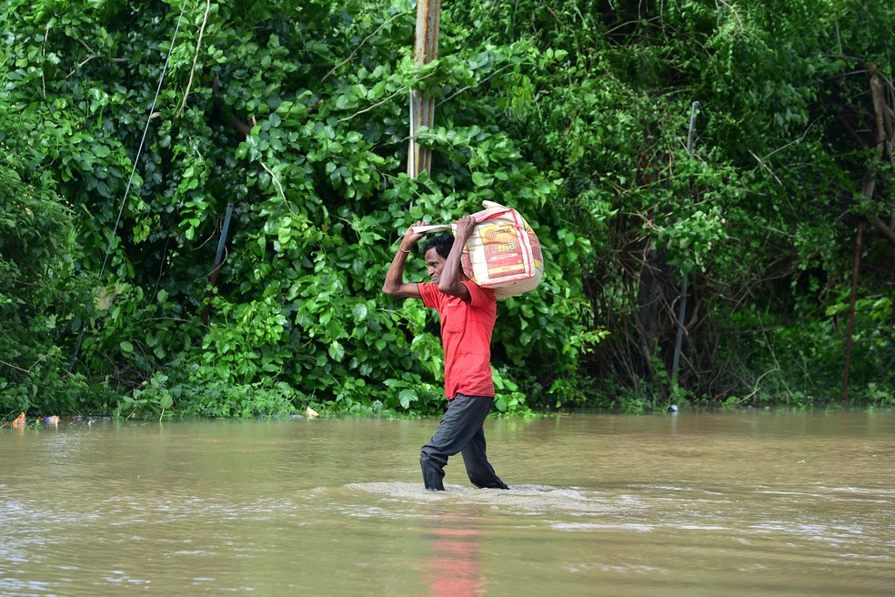 Um homem carrega seus pertences por uma rua inundada após fortes chuvas nos arredores de Ahmedabad em 28 de agosto de 2024 — Foto: Sam PANTHAKY / AFP