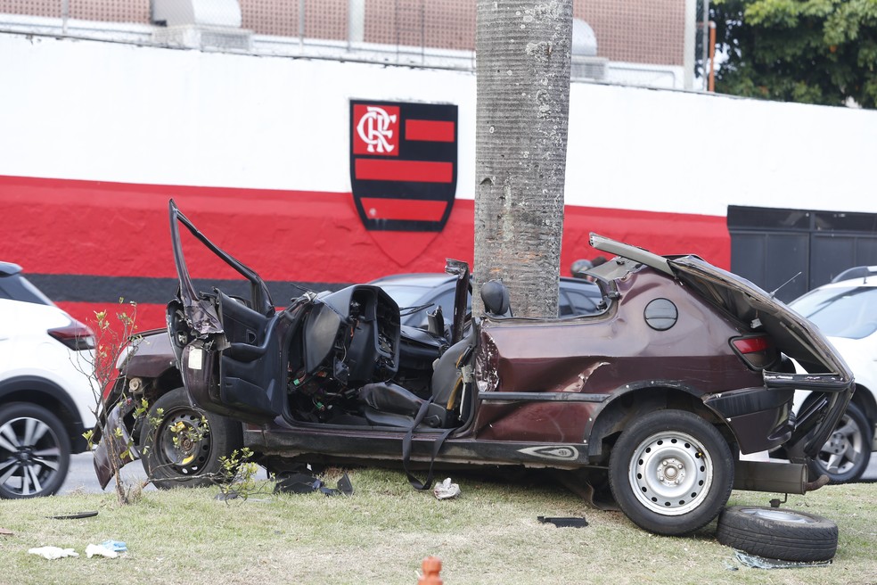 O Peugeot ficou completamente destruído após bater contra a palmeira — Foto: Fabiano Rocha/Agência O Globo