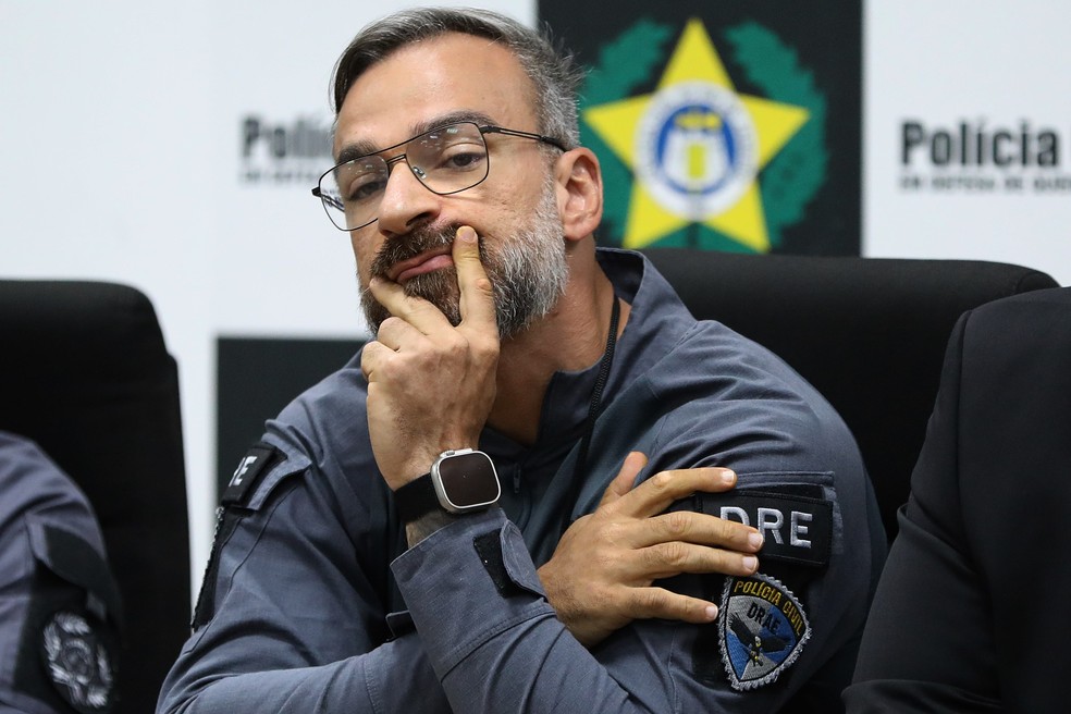 Marcus Amim,atual secretário da Polícia Civil durante coletiva de Imprensa na Cidade da Polícia em abril de 2023,quando era titular da DRE — Foto: Lucas Tavares/Agência O Globo