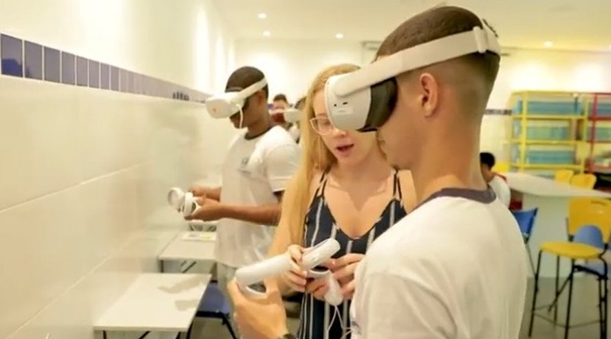 Estudantes da rede pública do Rio com óculos de realidade virtual: prêmio vai acolher projetos que discutam ética e tecnologia — Foto: Reprodução / Youtube