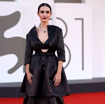 Lili Reinhart usou vestido Giorgio Armani preto de brilhos que tem decote coração — Foto: Getty Images