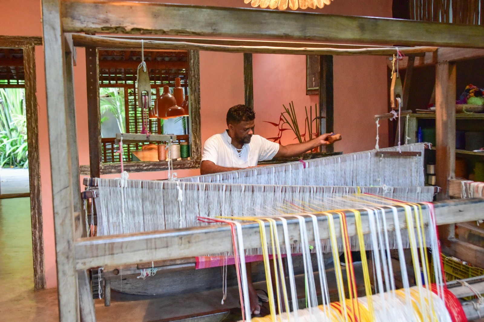 Peças do próprio tear,comandado pelo tecelão Evandro,fica à vista dentro do hotel — Foto: Elaine Neves/ O Globo
