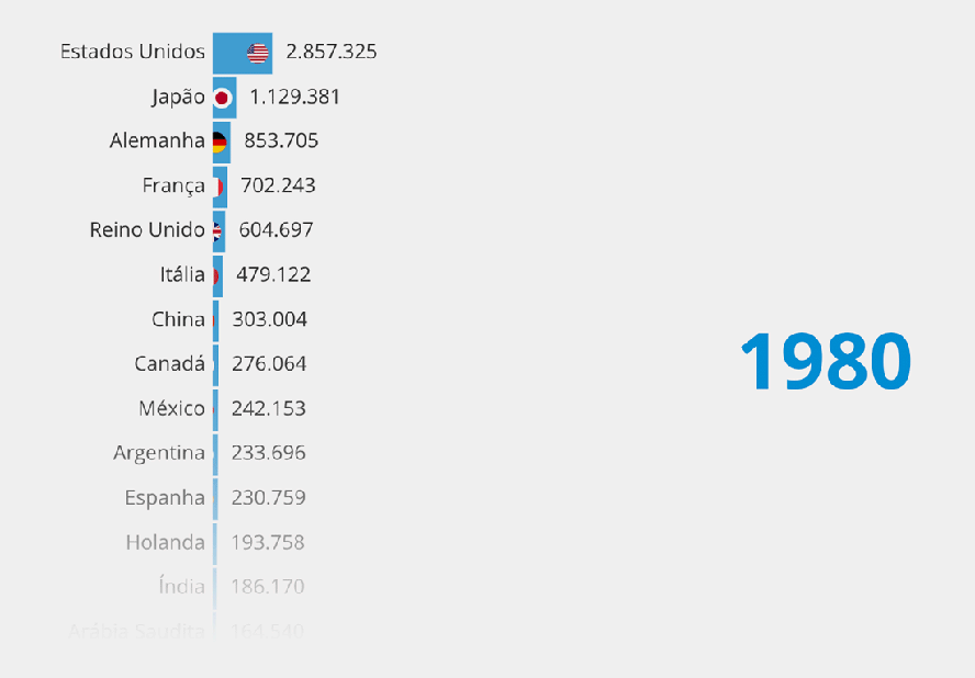 Confira abaixo,em infográfico animado,a “corrida dos PIBs” desde 1980 até 2023,ou seja,quem subiu e quem desceu no ranking global.