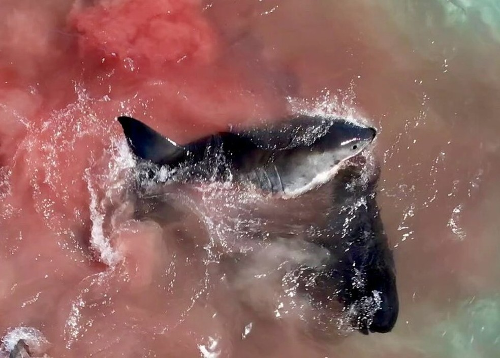 Vídeo mostra momento em que tubarão-branco se alimenta de baleia-piloto na Austrália; assista — Foto: Reprodução