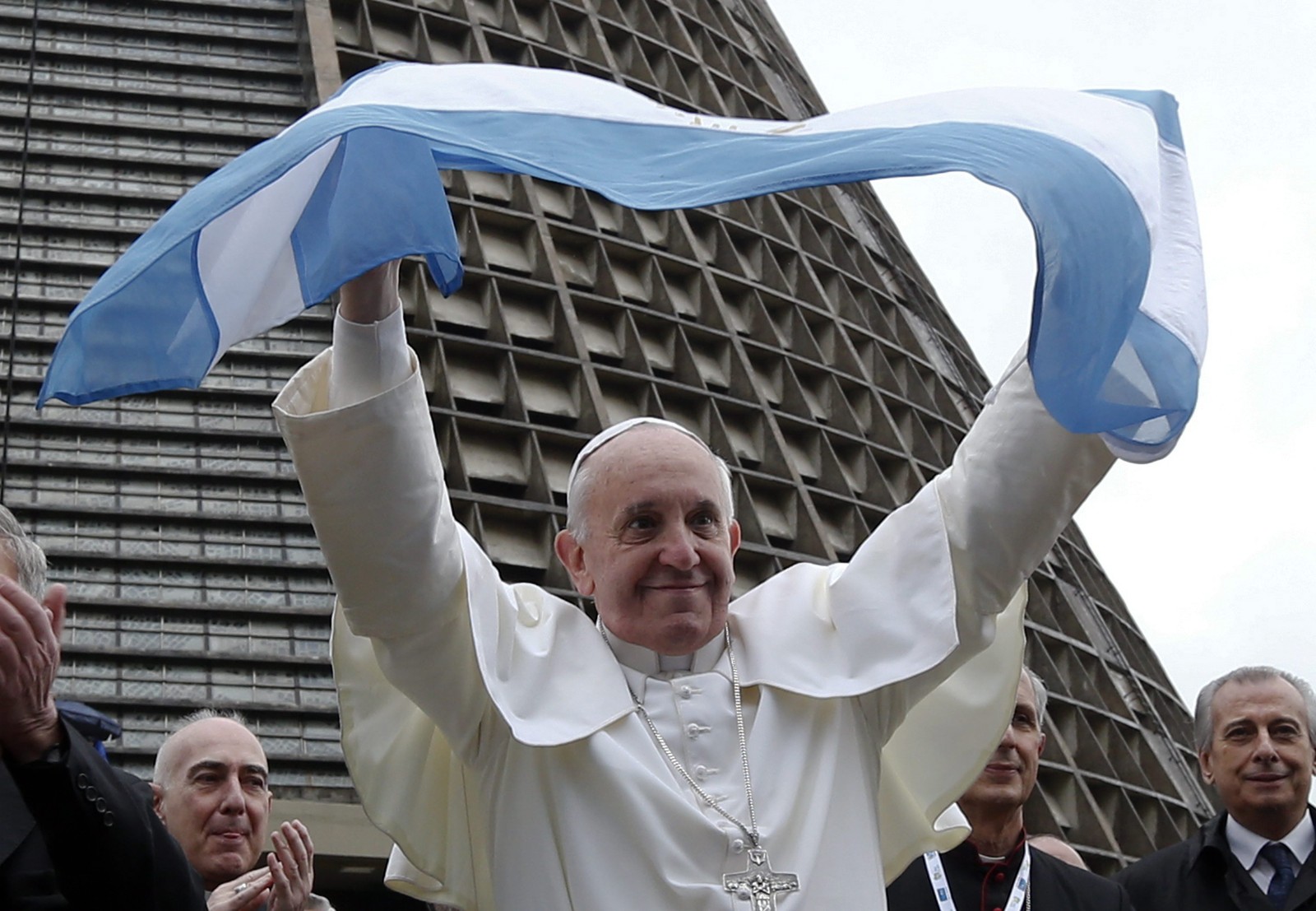 Papa Francisco segura uma bandeira da Argentina do lado de fora da Catedral Metropolitana do Rio de Janeiro em 25 de julho de 2013 — Foto: AFP PHOTO / Stefano Rellandini
