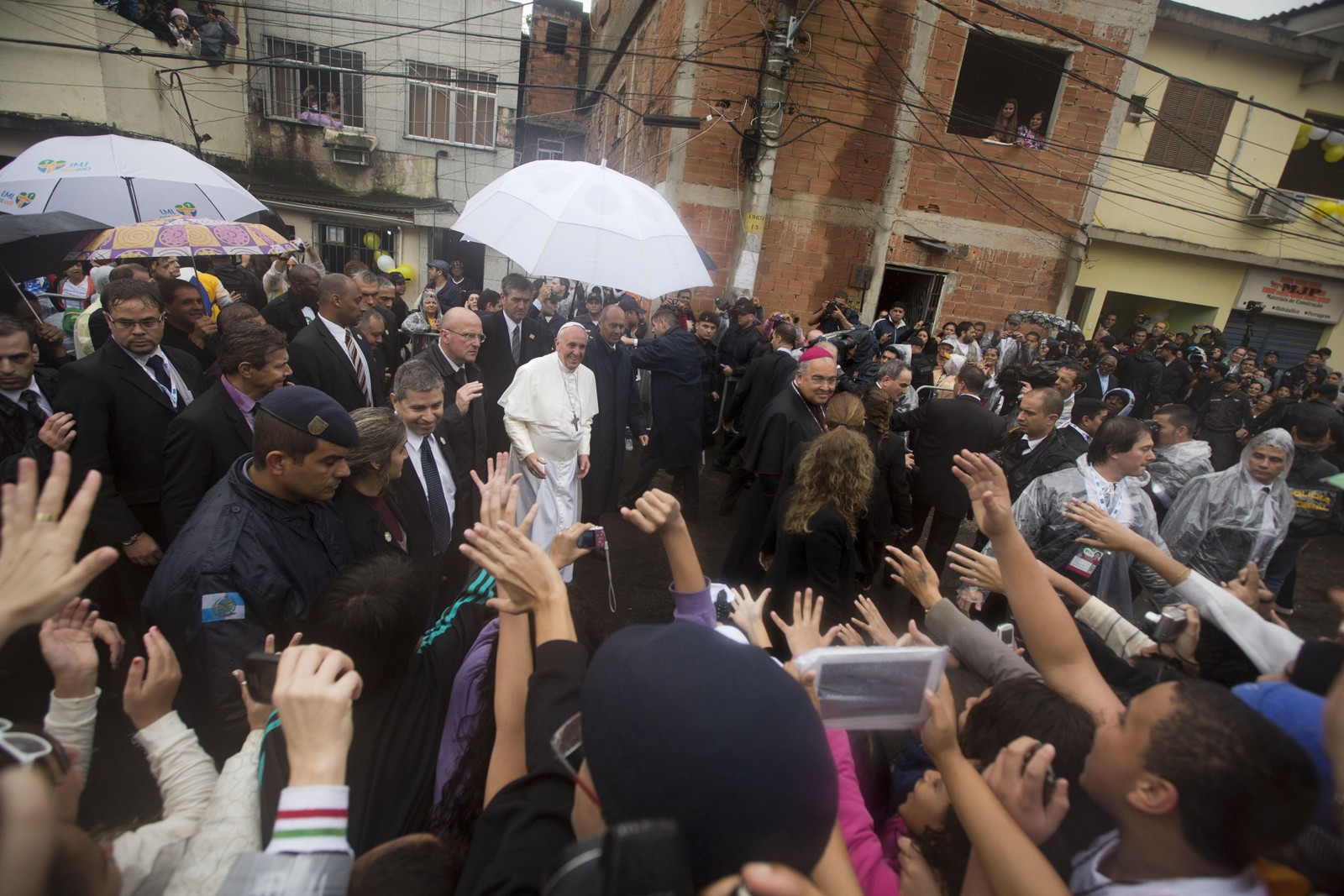 Pessoas saúdam o Papa Francisco,ao centro,enquanto ele visita a favela de Varginha,no Rio,em 25 de julho de 2013 — Foto: Victor R. Caivano / AP