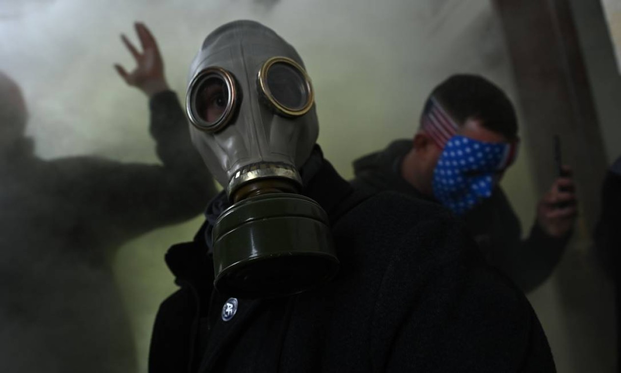 Apoiador de Trump usa uma máscara de gás enquanto invade o Congresso americano — Foto: BRENDAN SMIALOWSKI / AFP