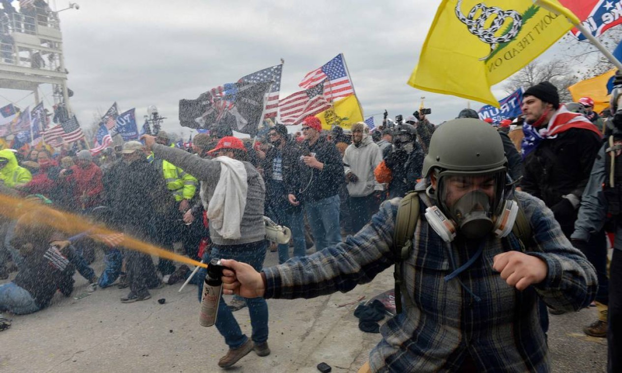 Policial do Capitólio atira spray de pimenta em um manifestante que tenta entrar no prédio do Congresso — Foto: POOL / REUTERS