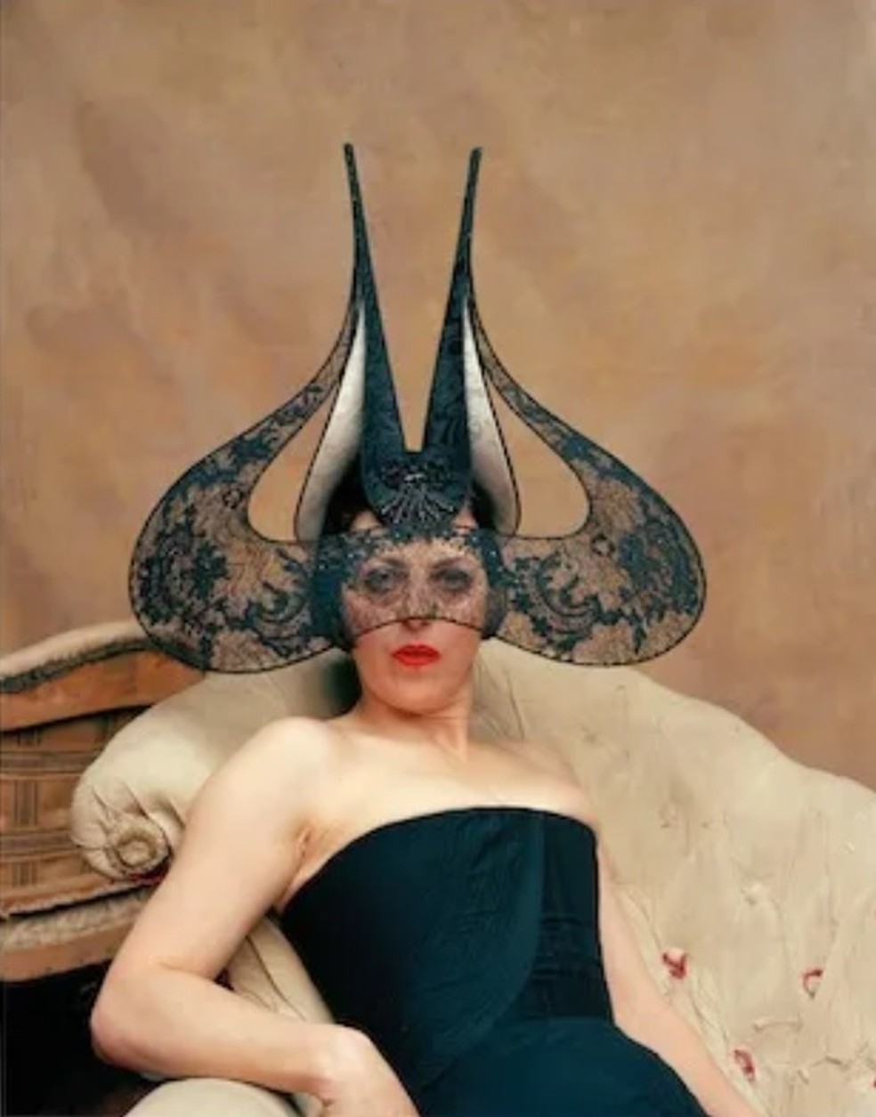 O modelo usado por Gaga foi produzido com veludo,brocado e renda e se estende à frente do rosto da artista,impendindo-a,por exemplo,de conseguir beijar o noivo,Michael Polansky,com quem está no evento. Era o tipo de acessório que Isabella Blow gostava,justamente por impedir o contato íntimo com terceiros.
