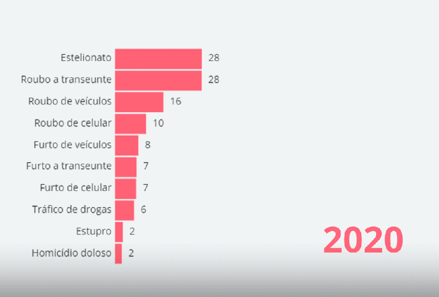 Um índice que vêm apresentando queda constante no período de 2020 a 2024 é o homicídio doloso. De janeiro a julho de 2020,foram 2.159 vítimas. No mesmo período deste ano,houve 1.683 mortes. Entre o ano passado e 2024,a queda nos homicídios foi de 14%. As ocorrências de tráfico de drogas ficaram perto da estabilidade na comparação de 2020 com 2024,mas apresentaram um crescimento de 6% do ano passado para este ano. Já os registros de estupro tiveram um aumento gradual nos últimos quatro anos,passando de 2.463 entre janeiro e julho de 2020 para 3.395 nos mesmos sete meses de 2024.