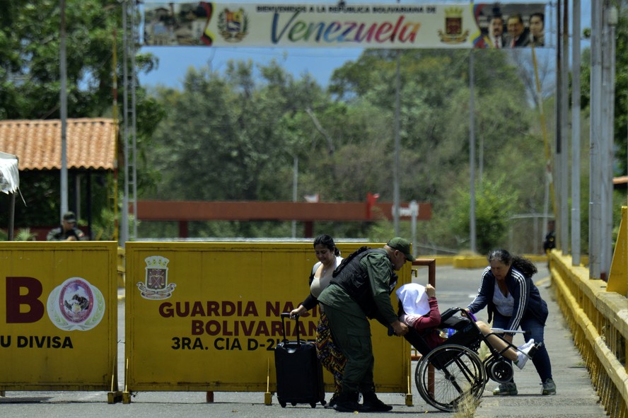 Mulher venezuelana em uma cadeira de rodas é ajudada por um membro da Guarda Nacional Venezuelana na ponte internacional Simon Bolivar após o fechamento da fronteira Colômbia-Venezuela — Foto: Schneyder Mendoza / AFP