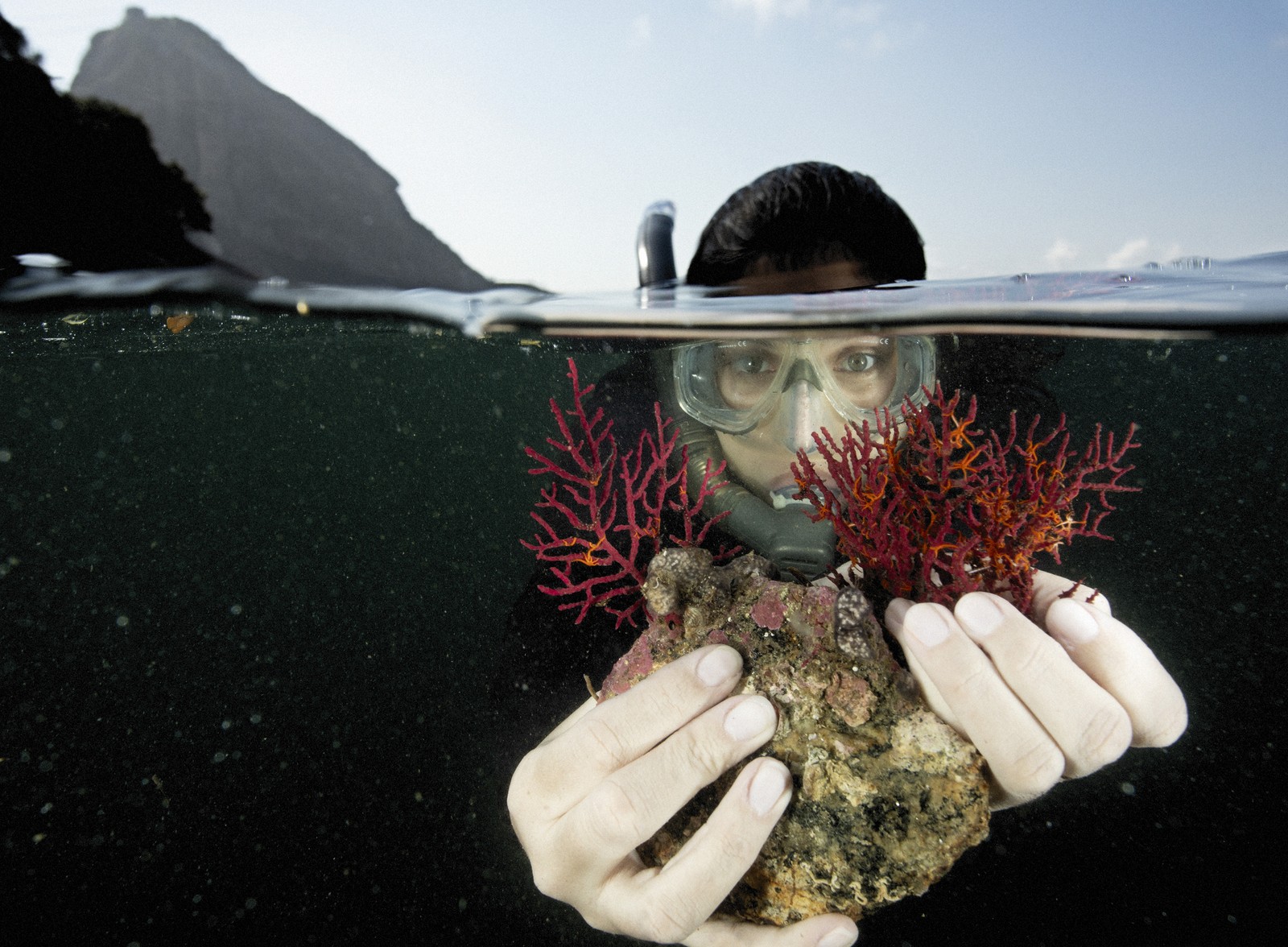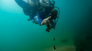 Pesquisadora da UniRio,em parceira com o Instituto Mar Urbano,mostra o ofiuróide (laranja) preso a coral. A espécie invasora pode ter sido trazida por ação humana,por meio de embarcações. — Foto: Instituto Mar Urbano / Ricardo Gomes / Divulgação