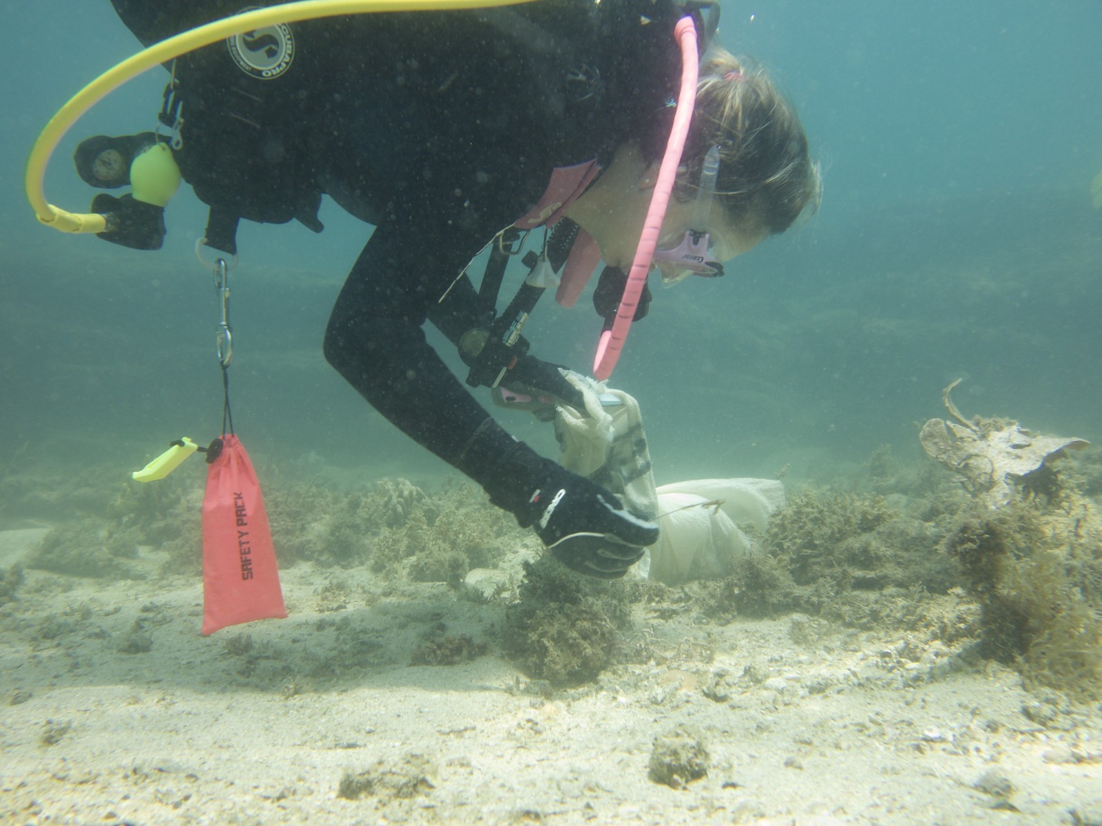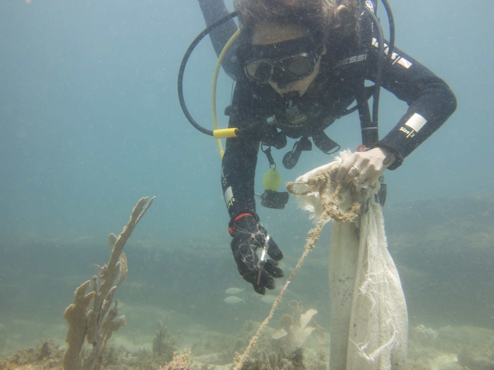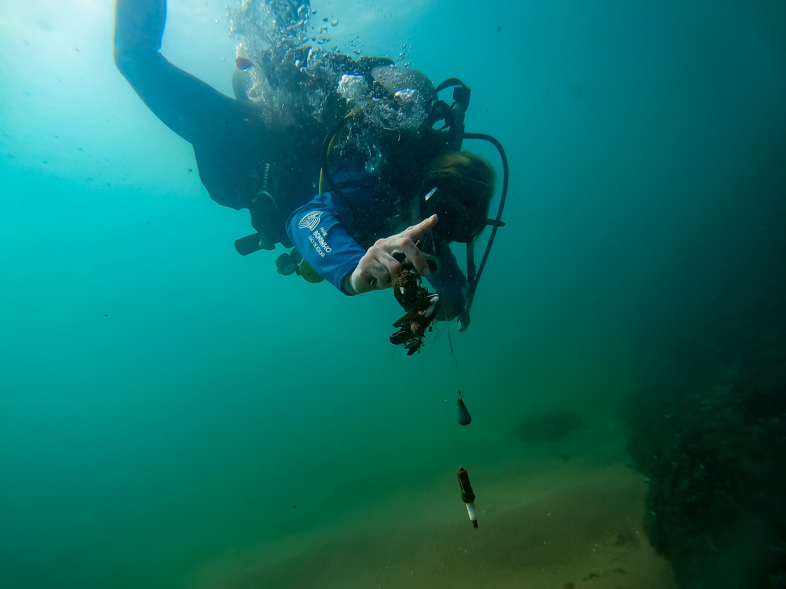 Voluntária da ong global Sea Shepherd coleta lixo do fundo do mar durante ação de limpeza — Foto: Sea Shepherd / Divulgação