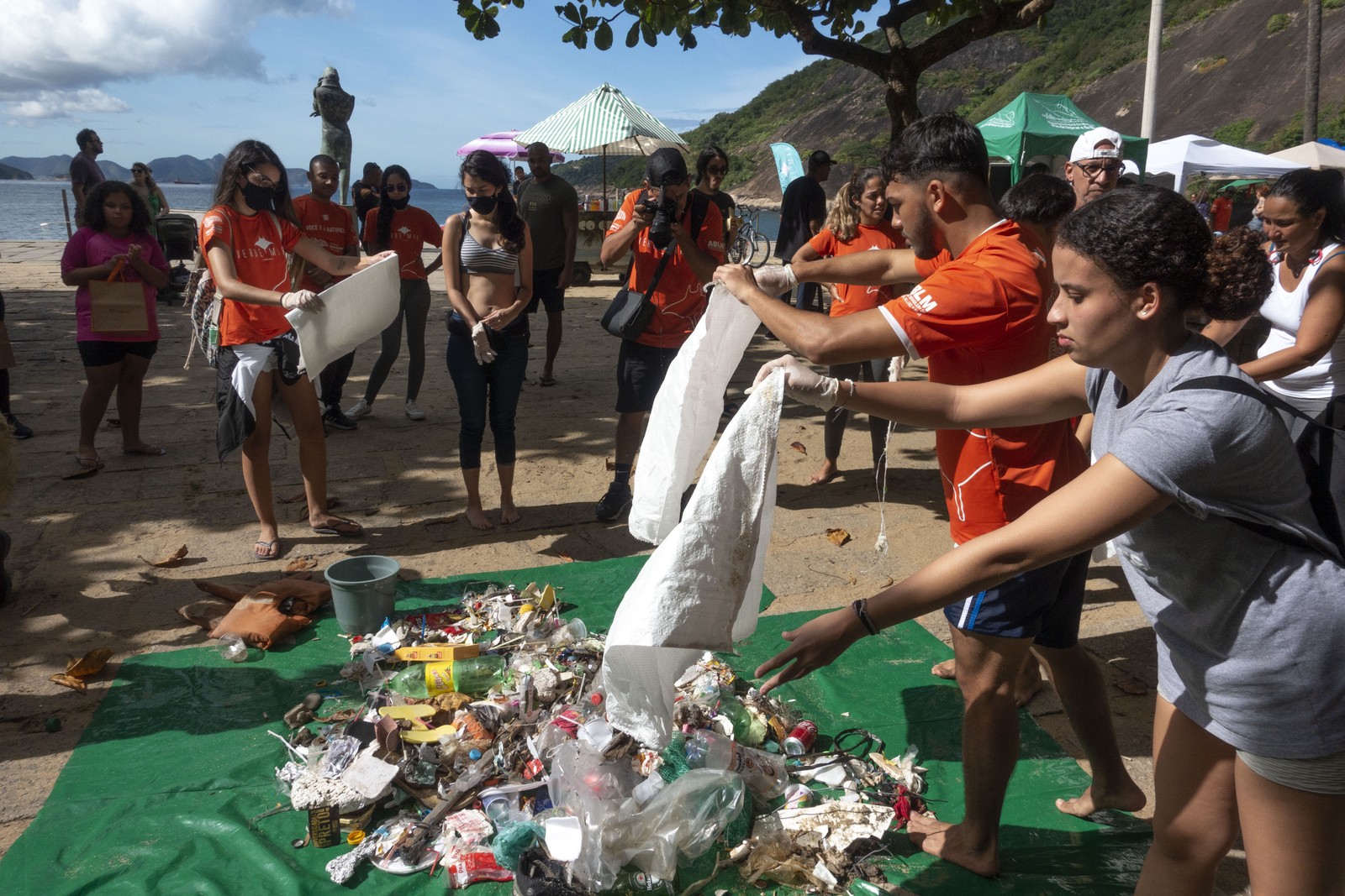 Voluntários do Projeto Verde Mar reúnem os resíduos coletados durante mutirão na Praia Vermelha,na Urca — Foto: Projeto Verde Mar / Divulgação