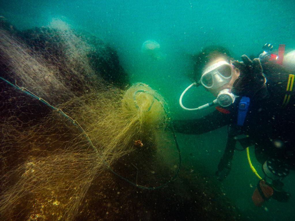 Voluntária da ong global Sea Shepherd encontra rede fantasma. O utensílio de pesca abandonado é um risco para os animais marinhos,que morrem ao ficarem presos. — Foto: Sea Shepherd / Divulgação