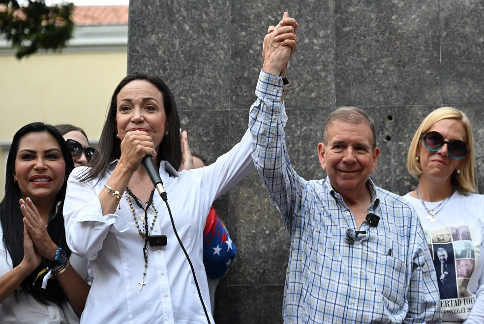 A líder da oposição Maria Corina Machado (E) segura as mãos do candidato presidencial venezuelano Edmundo Gonzalez Urrutia enquanto discursa durante encontro com fiéis cristãos em Caracas — Foto: Raul ARBOLEDA / AFP