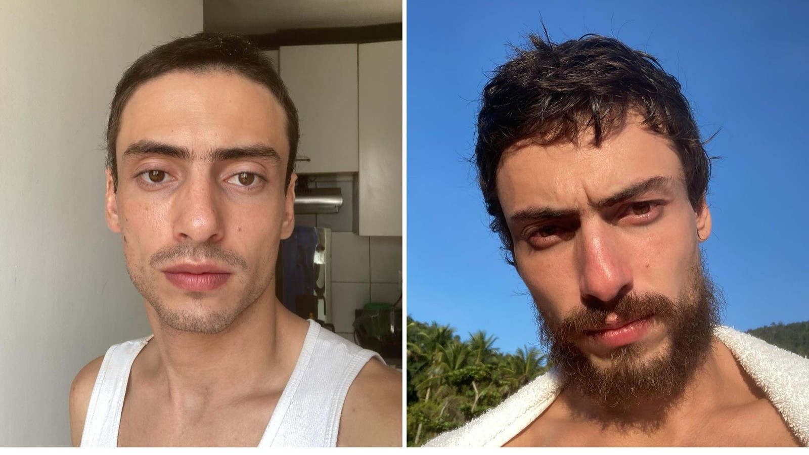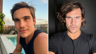 Paulo Mendes deixou a barba e os cabelos crescerem para interpretar Tomás,em 'Mania de você' — Foto: Globo/Estevam Avella e Globo/Fábio Rocha