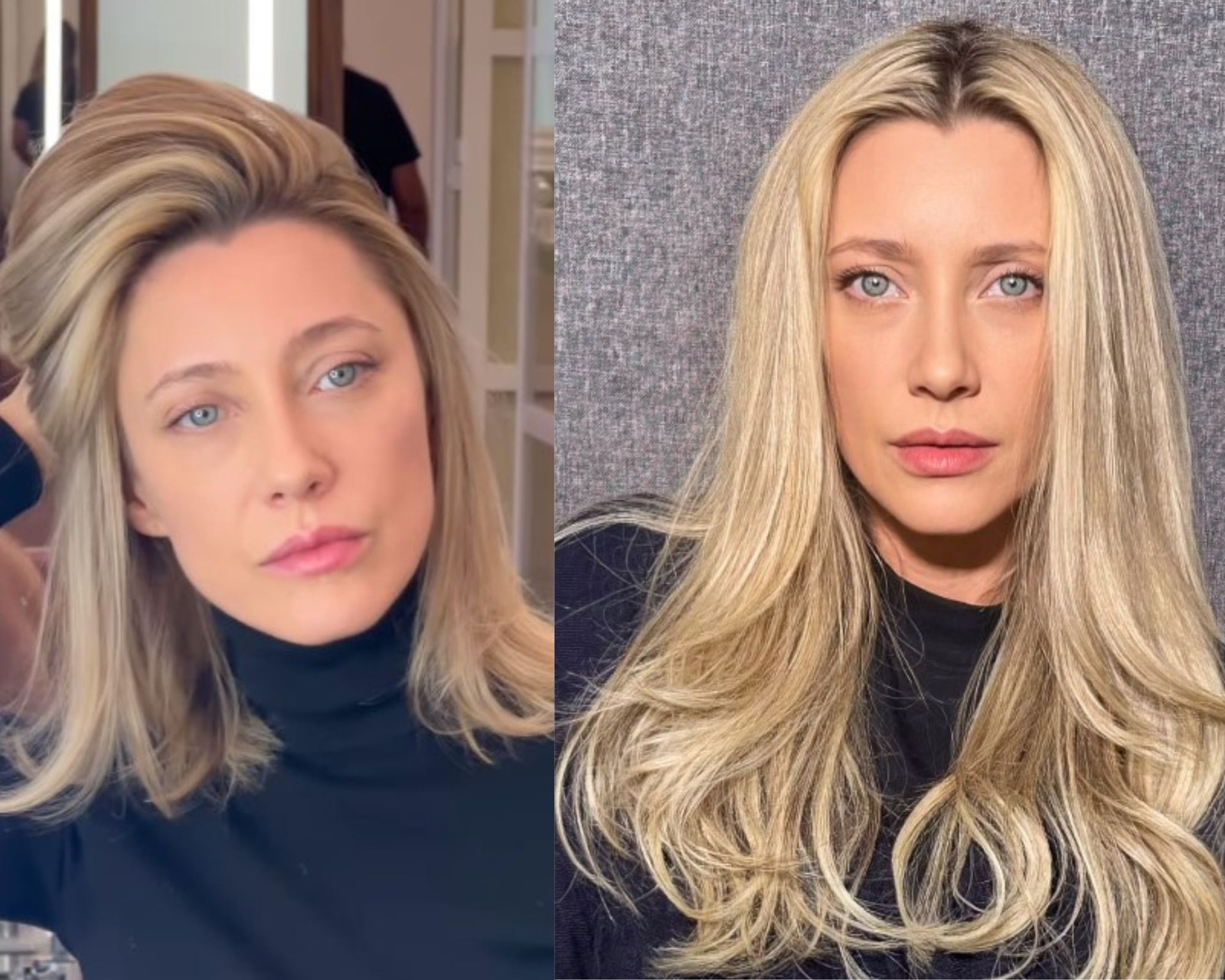 Mariana Ximenes estava com os cabelos na altura dos ombros e ruiva. Para viver Ísis,a atriz alongou os cabelos e deu uma leve clareada nos fios com mechas louras — Foto: Reprodução/Instagram e Globo/Fábio Rocha
