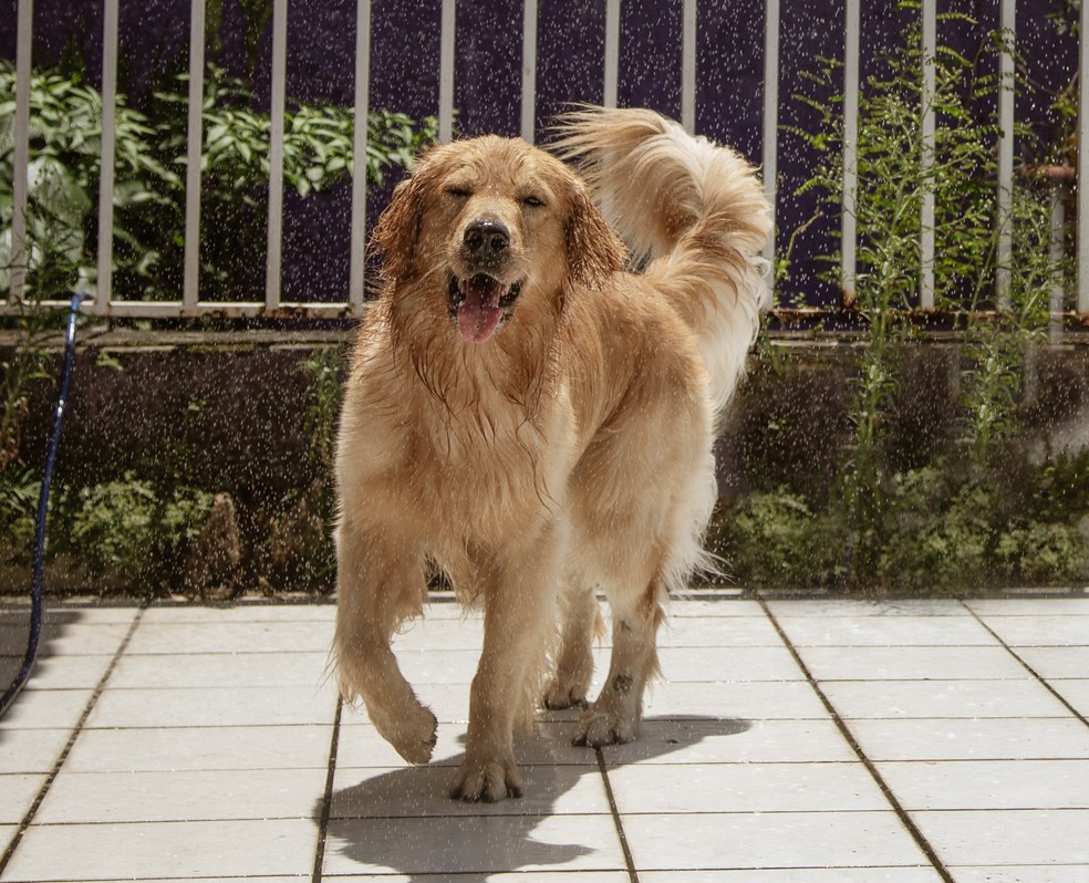 Cuidados com Pets. O cão Sol,da raça Golden Retriever se refresca com banho de mangueira — Foto: Paulo Moreira / Agência O Globo
