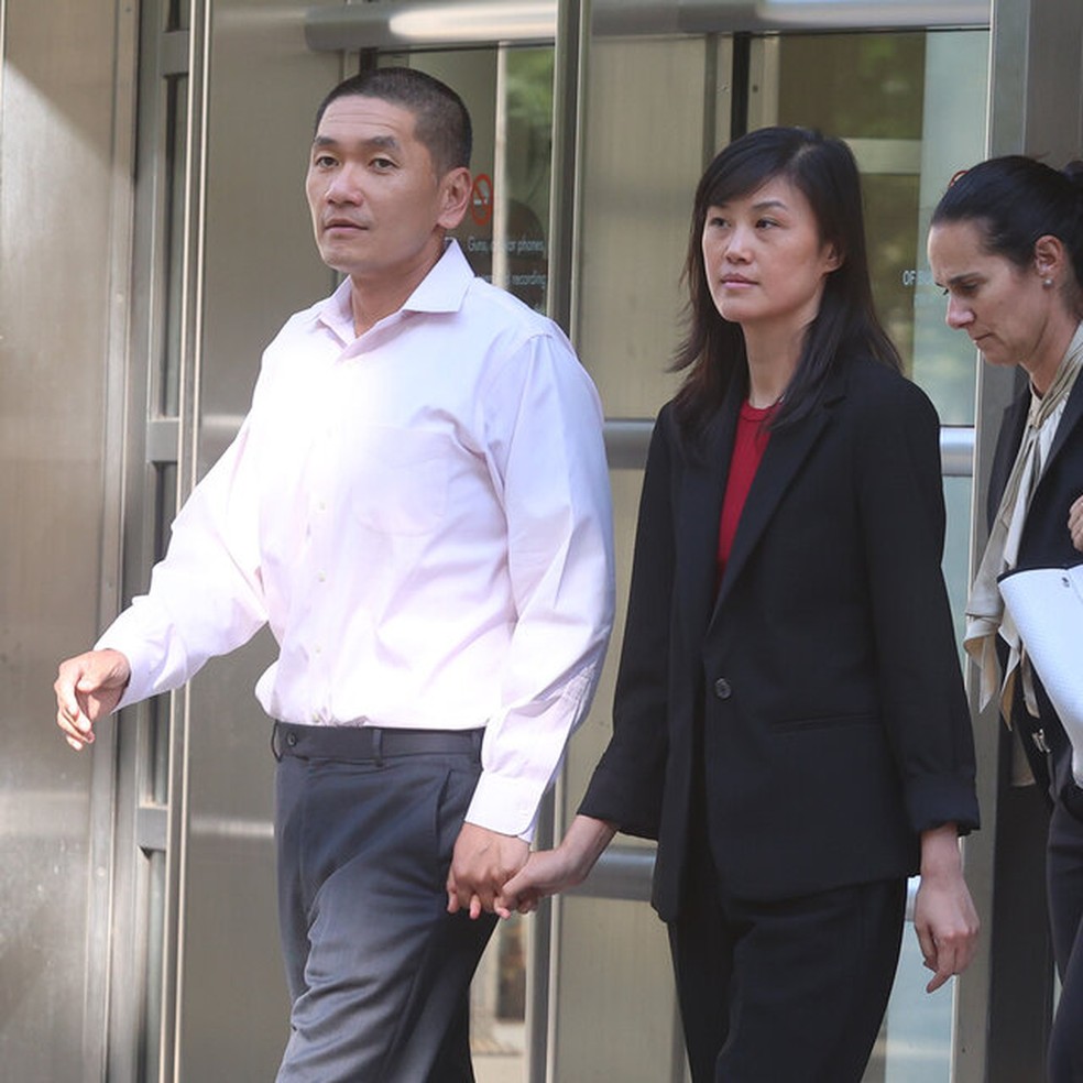 Acusada de ser espiã chinesa infiltrada para prejudicar relações americanas com Taiwan,Linda Su deixa prédio ao lado do marido,Chris Hu — Foto: Reprodução/NYT