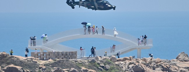 Turistas presenciam helicópteros militares chineses sobrevoam a Ilha de Pingtan,na província de Fujian,um dos pontos do litoral chinês mais próximos de Taiwan — Foto: HECTOR RETAMAL / AFP