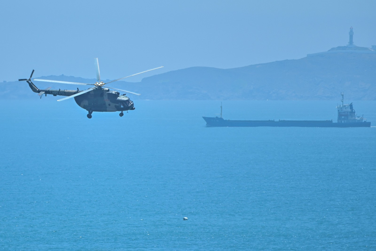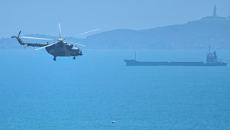 Helicóptero militar chinês sobrevoa a ilha de Pingtan,um dos pontos mais próximos entre China e Taiwan,na província de Fujian — Foto: Hector RETAMAL/AFP