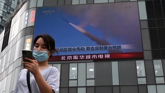 Telão no centro de Taipé mostra míssil disparado durante exercício militar da China em Taiwan — Foto: HECTOR RETAMAL / AFP