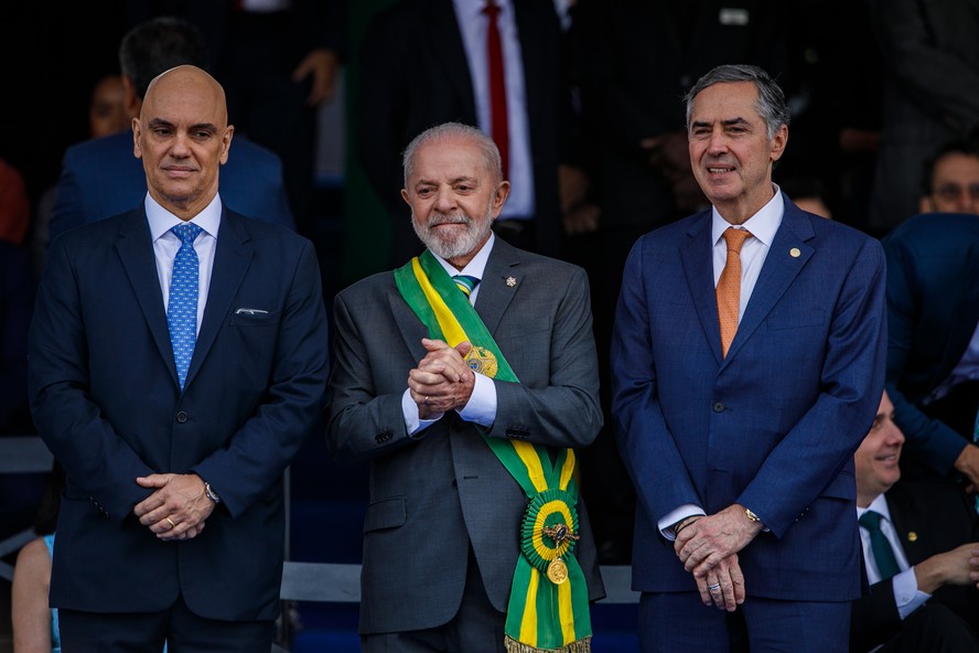Presidente Lula,Alexandre de Moraes e Barroso (STF) no 7 de Setembro - Desfile celebra o Dia da Independência do Brasil na Esplanada dos Ministérios,em Brasília — Foto: Brenno Carvalho / Agência O Globo