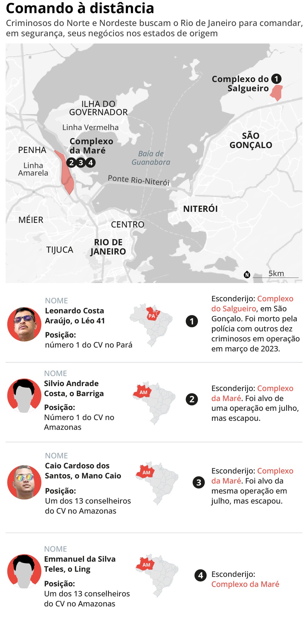 Os morros do Rio escondem hoje dezenas dos principais chefes do Comando Vermelho do Norte e do Nordeste do país,em especial dos estados onde a organização criminosa é predominante,segundo Victor dos Santos,secretário de Segurança Pública. São bandidos foragidos do Pará,do Amazonas,do Acre,de Rondônia,do Ceará,da Bahia,da Paraíba e do Rio Grande do Norte que,de favelas da capital e da Região Metropolitana,ordenam os mais variados crimes,como o tráfico de drogas e armas,a execução de inimigos e até a cobrança de taxas a candidatos à eleição municipal que querem fazer campanhas em territórios que controlam.