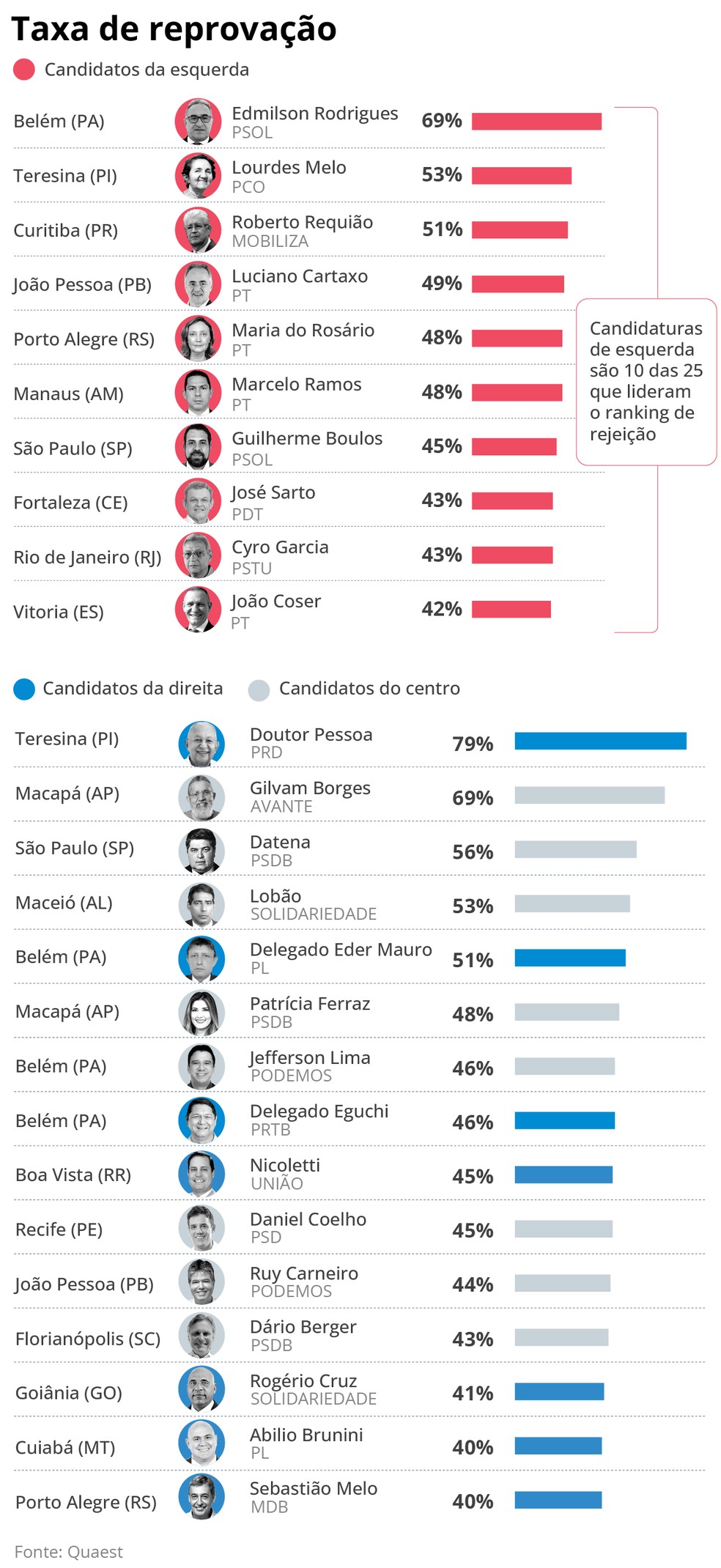 Apesar de a esquerda dominar o ranking,o candidato mais rejeitado do país pertence ao campo da direita: o prefeito de Teresina e candidato à reeleição,Doutor Pessoa (PRD). Com 5% do eleitorado ao seu lado para um novo mandato,ele é rejeitado por 79% dos eleitores. Sua gestão na cidade foi marcada por uma forte crise na saúde,que perpassou a falta de médicos e a ausência de repasses a funcionários terceirizados.