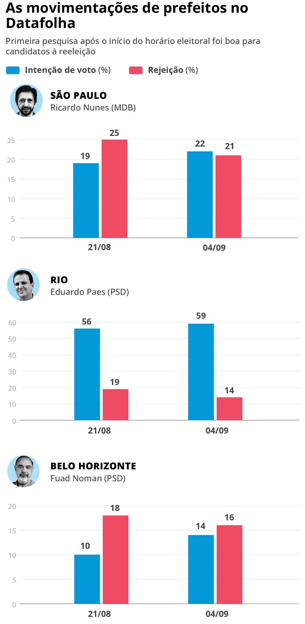 O início do horário eleitoral teve impacto positivo para os prefeitos de São Paulo,Rio e Belo Horizonte. A primeira pesquisa Datafolha desde o início da propaganda no rádio e na TV,divulgada na última quinta-feira,consolidou o favoritismo de Eduardo Paes (PSD) na disputa carioca. Já Ricardo Nunes (MDB),na capital paulista,e Fuad Noman (PSD),na mineira,ganharam motivos para acreditar que as inserções podem ajudá-los nos processos eleitorais embaralhados que enfrentam este ano.